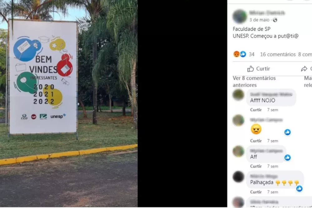 Um banner exposto na entrada de uma universidade em Bauru