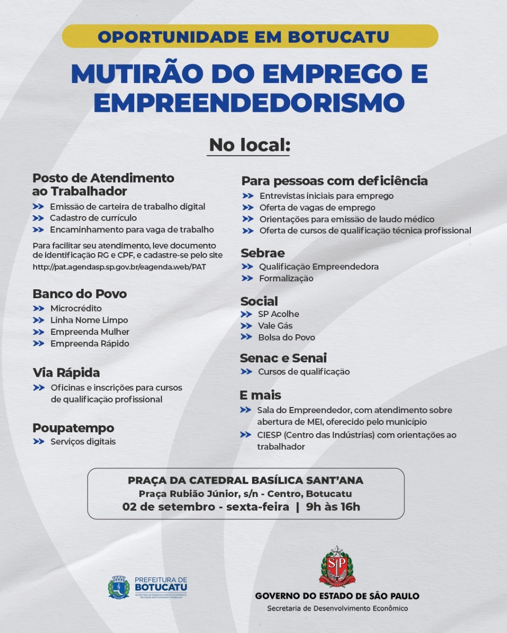 Na próxima sexta-feira, 02 de setembro, a Prefeitura de Botucatu, através da Secretaria de Desenvolvimento Econômico, Relações Institucionais e Trabalho, em parceria com a Secretaria Estadual de Desenvolvimento Econômico, realizará o Mutirão do Emprego e Empreendedorismo.