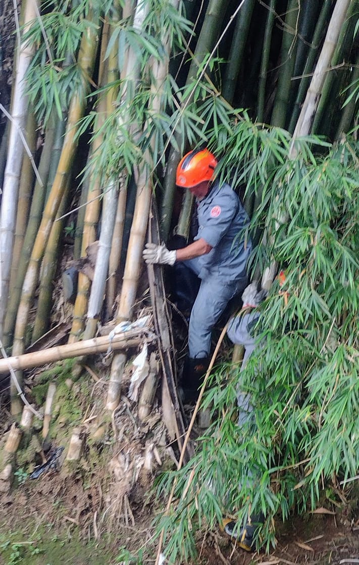 Foi necessária uma escada para transpor o rio para acessar o bambuzal e com o uso de serra sabre foi cortado alguns galhos para acessar e livrar a cachorra. O animal foi deixado aos cuidados da proprietária que estava no local acompanhado o salvamento.