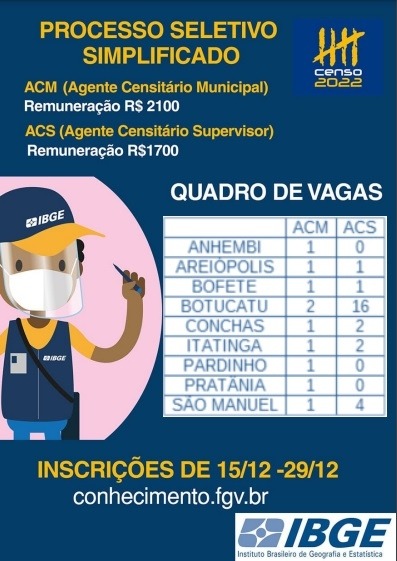 Um segundo processo seletivo para Censo 2022 visa contratar 5.450 pessoas para a função de Agente Censitário Municipal (ACM) e 18.420 para a função de Agente Censitário Supervisor (ACS). As inscrições estão abertas até o dia 29 de dezembro. Os interessados devem se inscrever no site da Fundação Getúlio Vargas (FGV). A inscrição é única para ACS e ACM e a taxa é de R$ 60,50. Os candidatos precisam ter nível médio completo. O salário para ACM é R$ 2.100 e ACS R$ 1.700, com jornada de 40 horas semanais, sendo oito horas diárias.