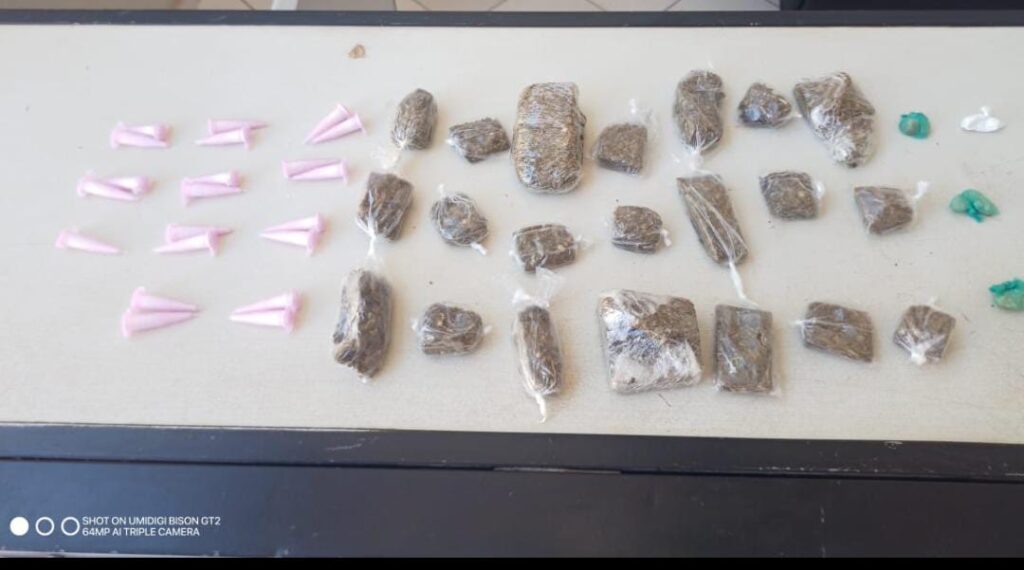 Dentro da sacola foram encontrados 21 pinos de cocaína, 21 porções de maconha e três papelotes de crack.